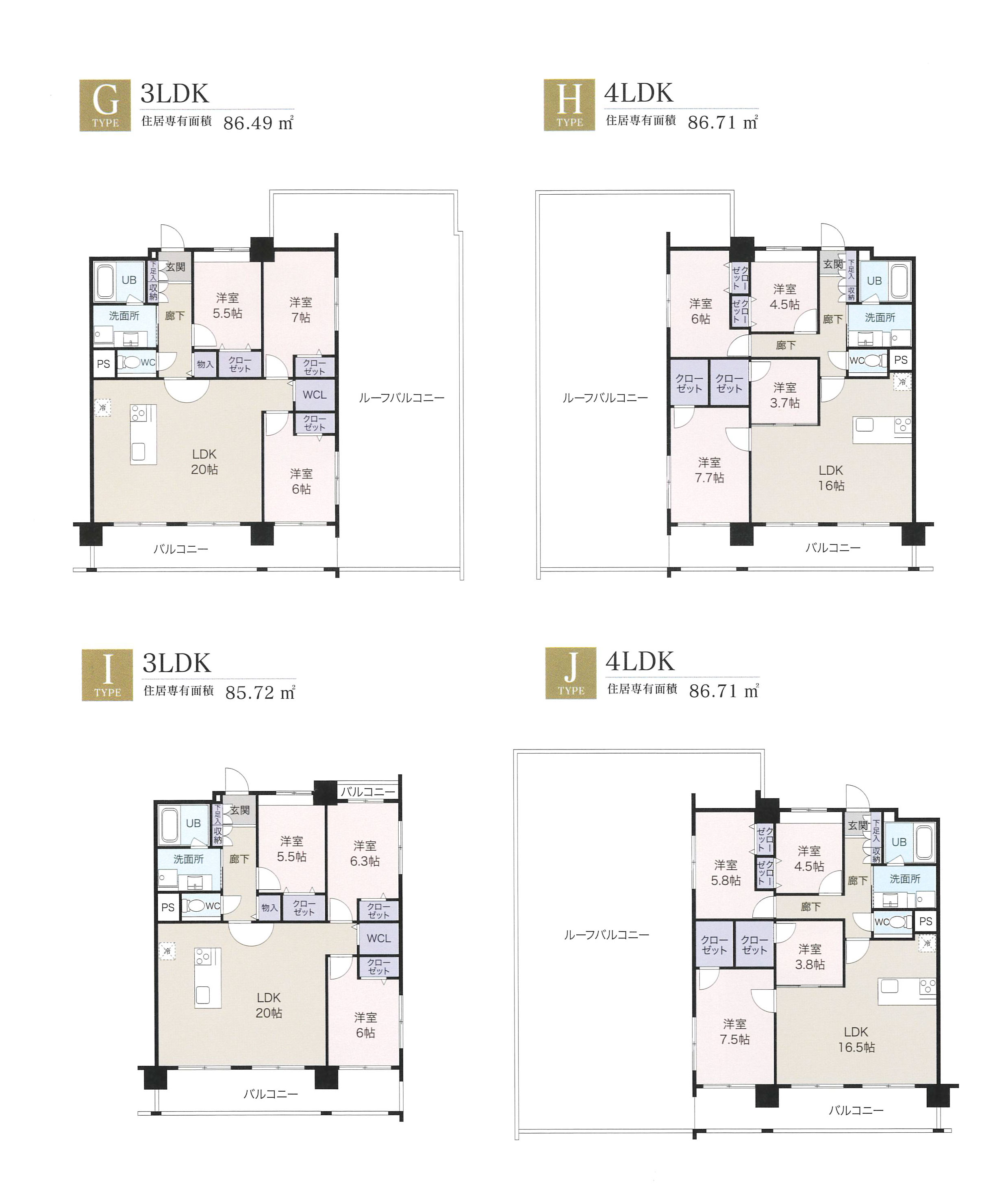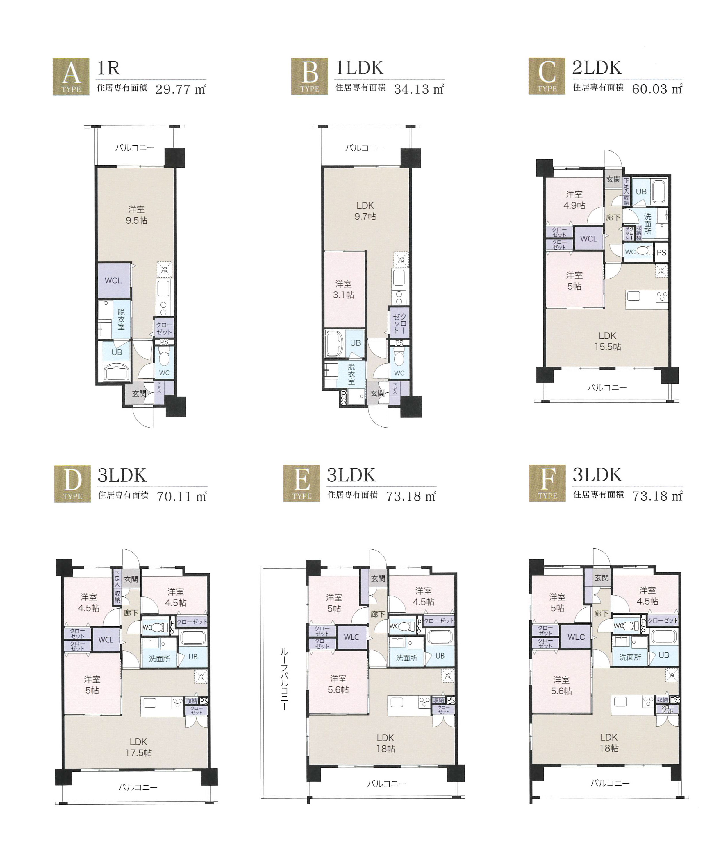 コンパクトに暮らしたい、ゆったり生活したい、優雅な空間が欲しいなどの希望に合うルームタイプを選んでいただけます。どのタイプにも防犯、防音、水回りの利便性、空間のゆとりに配慮して生活のクオリティを高める設備を完備しています。